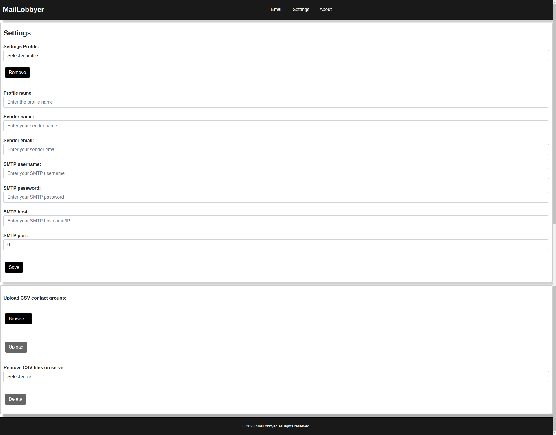 - The main page where the user can input the email data, along with selection of a CSV emailing list. In addition the user selects a settings profile which contains the SMTP server information and the sender name and email address.